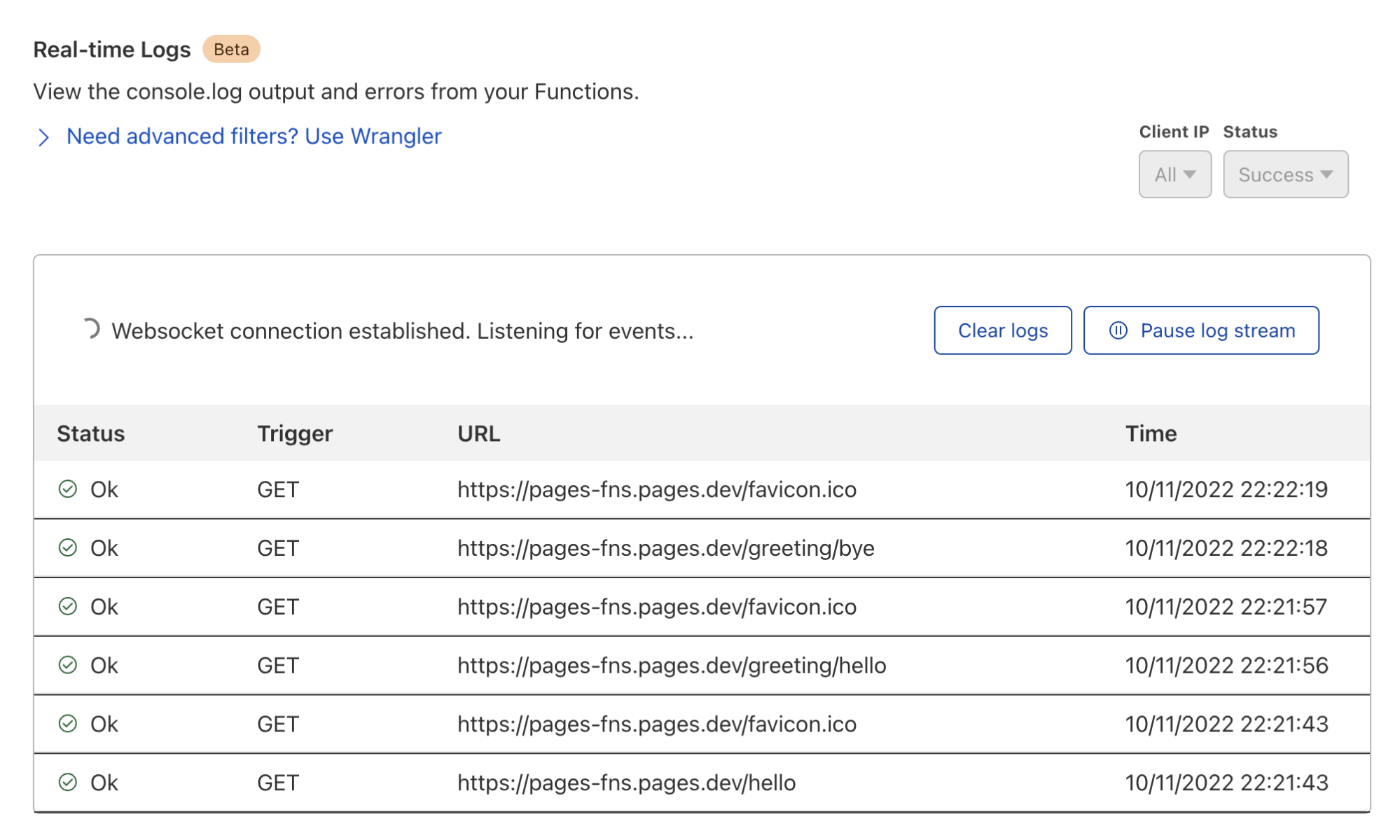 You can now easily view logs for your Functions by “tailing” your logs. For basic information like outcome and request IP, you can navigate to the Pages dashboard to obtain relevant logs.