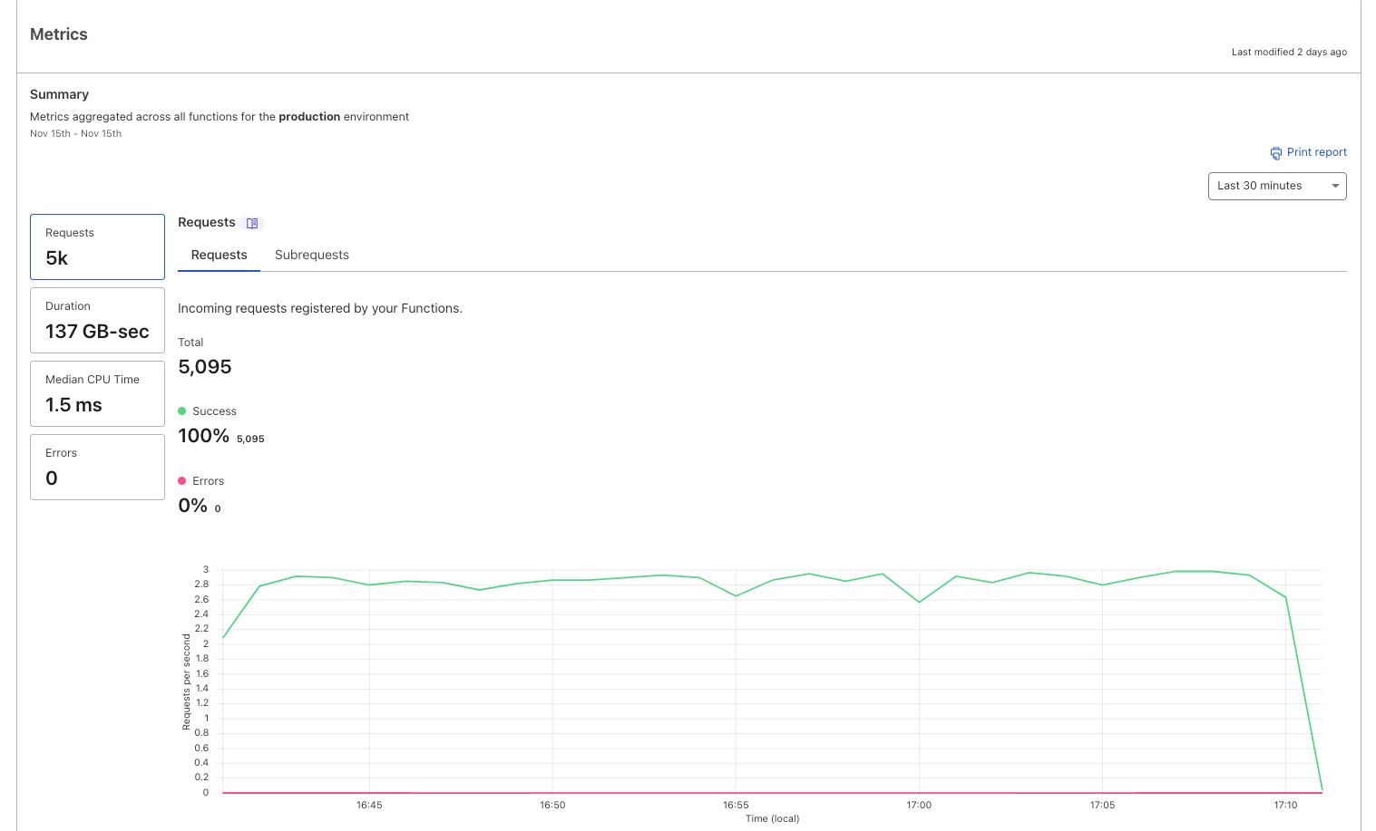 In the dashboard, Pages aggregates data for your Functions in the form of request successes/error metrics and invocation status. You can refer to your metrics dashboard not only to better understand your usage on a per-project basis but also to get a pulse check on the health of your Functions by catching success/error volumes.