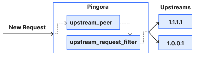 Let's explore Pingora's programmable API by building a simple load balancer. The load balancer will select between https://1.1.1.1/ and https://1.0.0.1/ to be the upstream in a round-robin fashion.