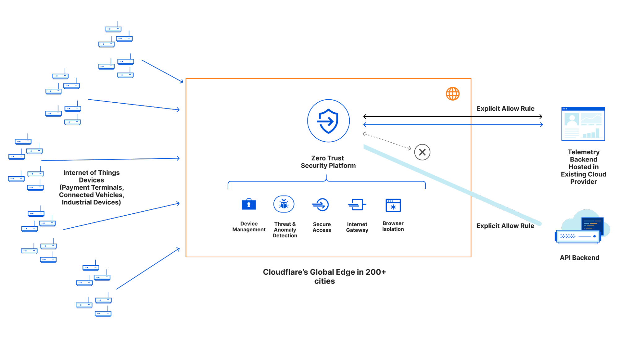 Unlike humans, who need to be able to access a potentially unbounded number of destinations (websites), the endpoints that an IoT device needs to speak to are typically far more bounded. But in practice, there are often few controls in place (or available) to ensure that a device only speaks to your API backend, your storage bucket, and/or your telemetry endpoint.