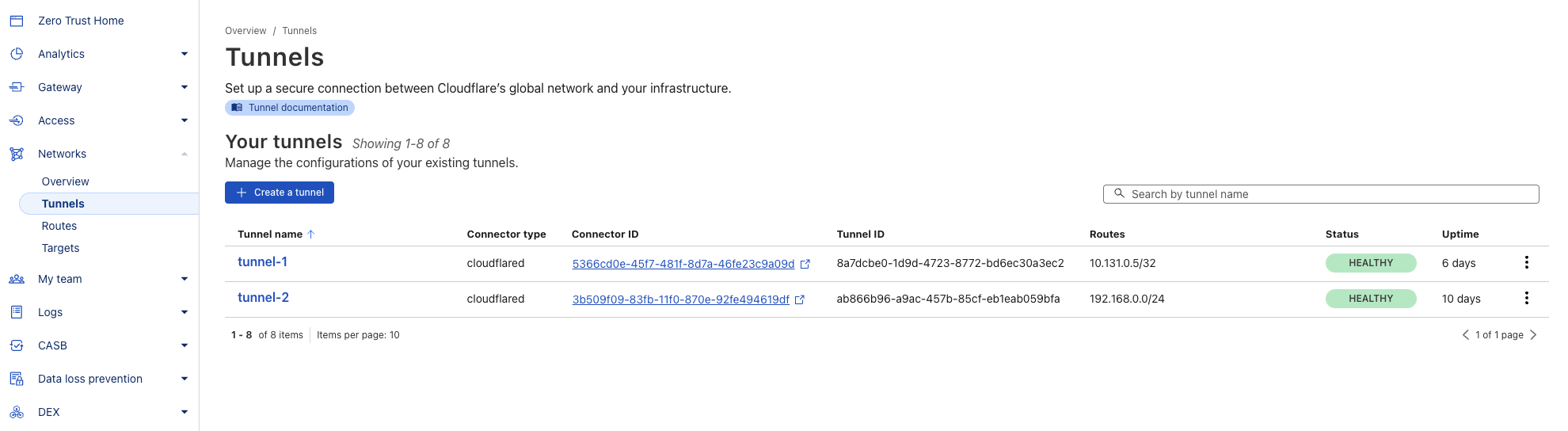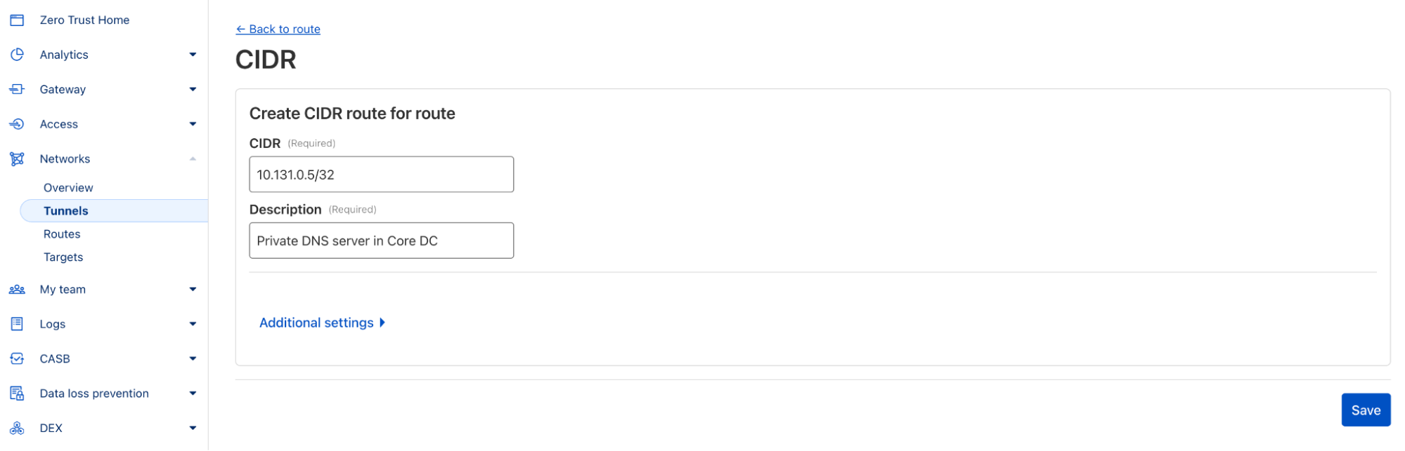 Create an IP Route: In the Networks > Tunnels area of your Zero Trust dashboard, create a route for the IP address of your private DNS server (e.g.,