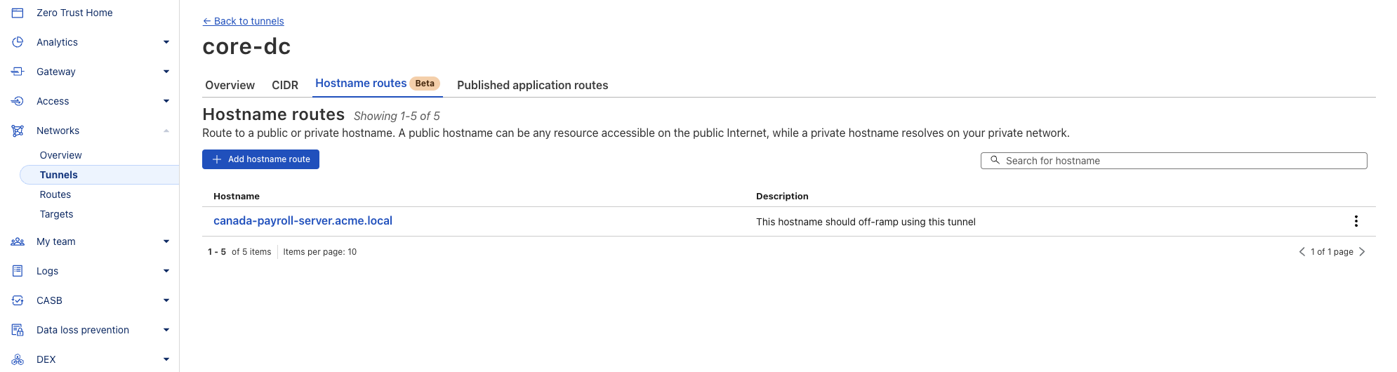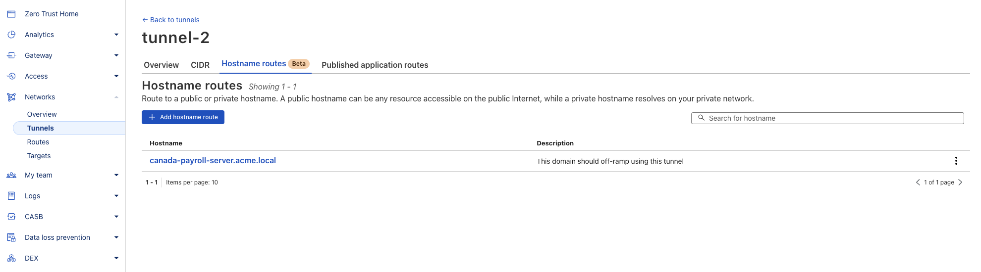 Create a Hostname Route: In your Zero Trust dashboard, create a hostname route that binds canada-payroll-server.acme.local