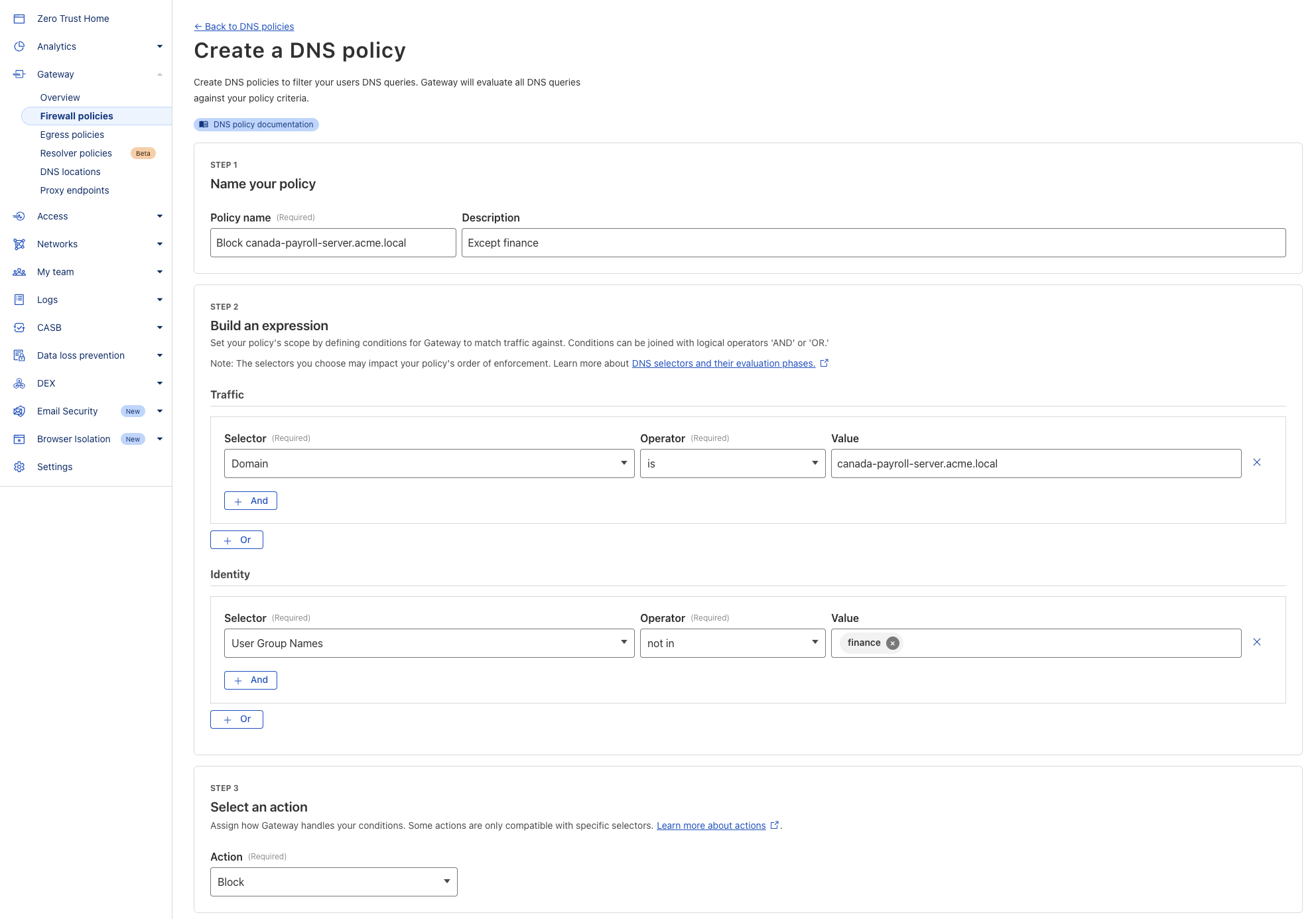 To see this in action, let's create a policy from our earlier example: we want to grant employees in the "finance" group located in Canada access to canada-payroll-server.acme.local