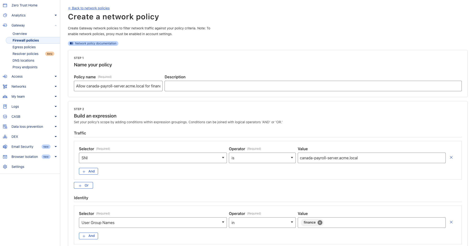 . This is ideal for applications accessible over HTTPS on port 443.In Cloudflare Gateway (for HTTPS applications): Alternatively, write a Gateway policy that grants employees in the “finance” group access to the SNI
