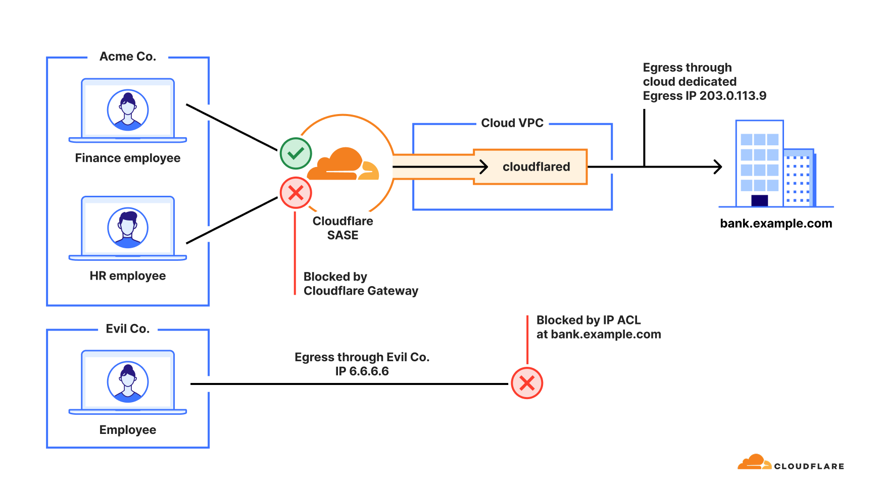 Force traffic through your dedicated IP. First, you deploy a Cloudflare Tunnel in the network that owns your dedicated IP (for example, your primary VPC in a cloud provider). All traffic you send through this tunnel will exit to the Internet with