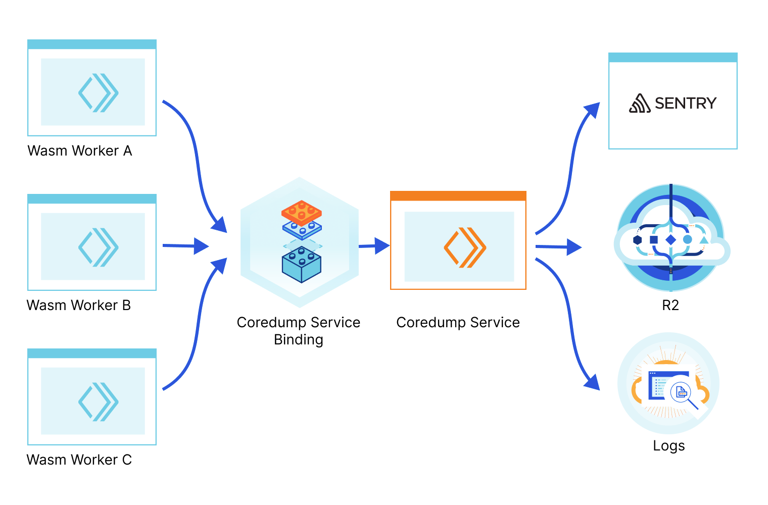 Today we're open-sourcing the Wasm Coredump Service and enabling anyone to deploy it. This service collects the Wasm core dumps originating from your projects and applications when they crash, parses them, prints an exception with the stack information in the logs, and can optionally store the full core dump in a file in an R2 bucket (which you can then use with wasmgdb) or send the exception to Sentry.