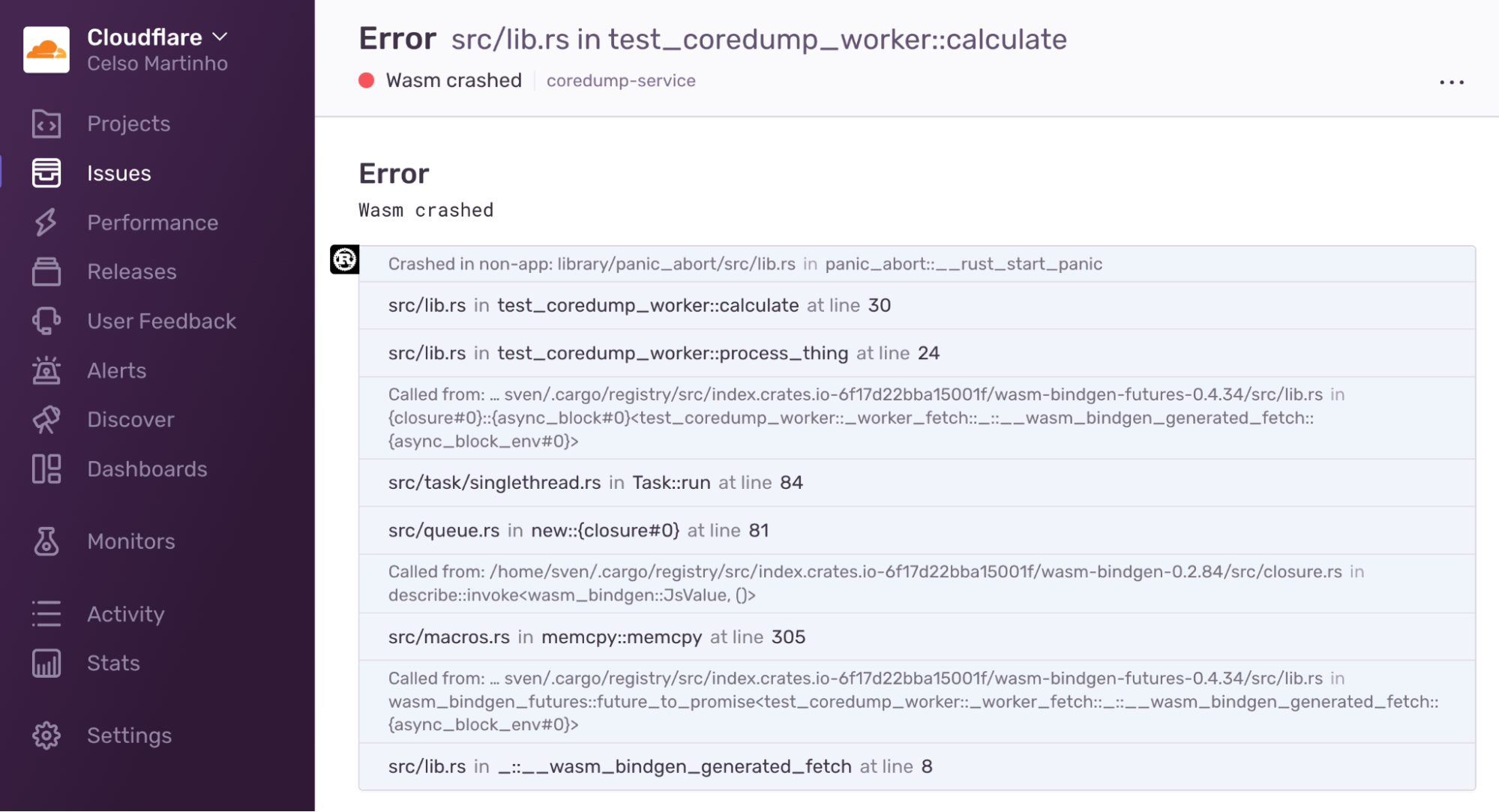 Here’s an example of a Wasm core dump exception in Sentry: