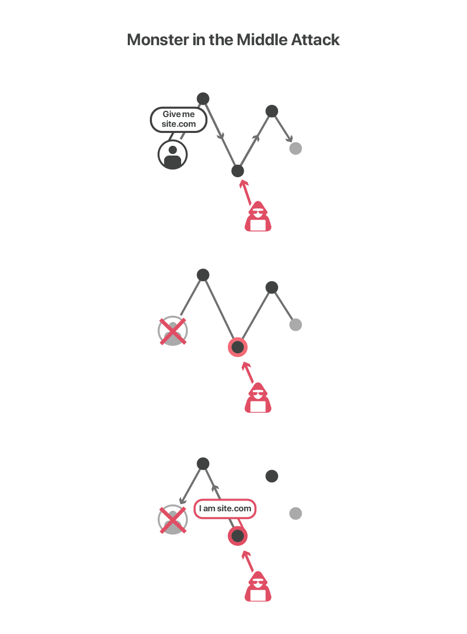 The Domain Name System (DNS) is the phone book of the Internet. Or, for anyone under 25 who doesn’t remember phone books, it’s the system that takes hostnames (like cloudflare.com or facebook.com) and returns the Internet address where that host can be found. For example, as of this publication, www.cloudflare.com is 104.17.209.9 and 104.17.210.9 (IPv4) and 2606:4700::c629:d7a2, 2606:4700::c629:d6a2 (IPv6). Like BGP, DNS is completely insecure. Queries and responses sent unencrypted over the Internet are modifiable by anyone on the path.