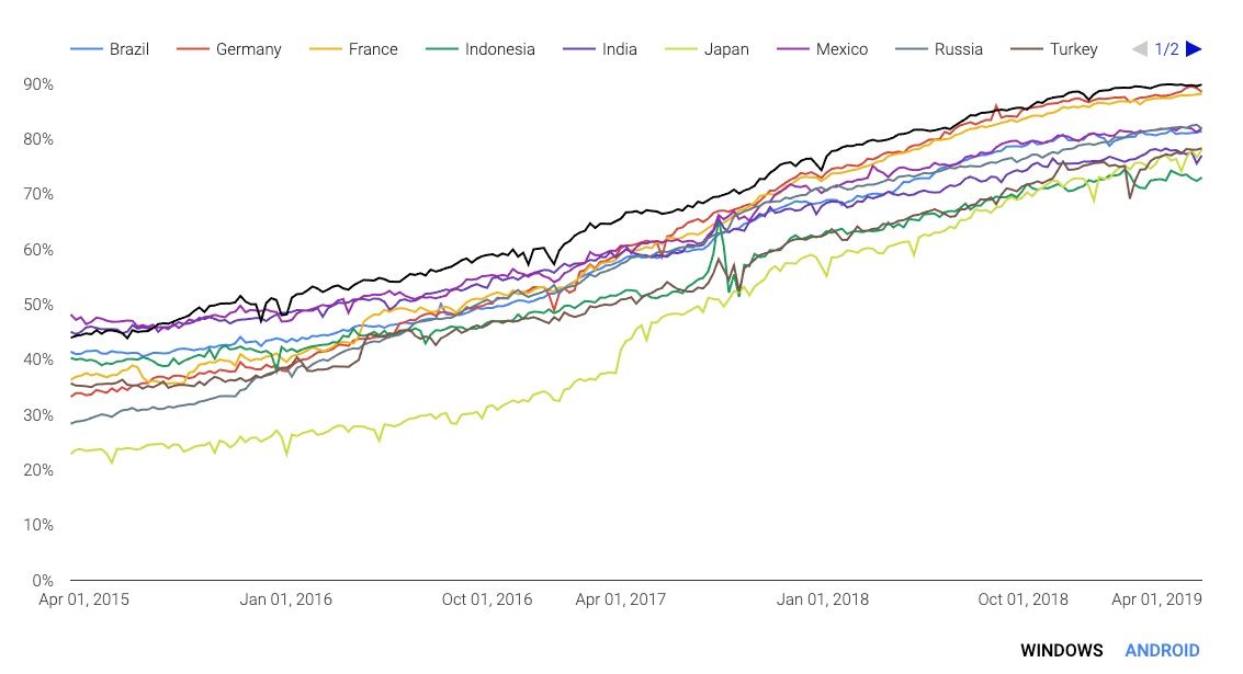Browsers make TLS adoption appealing to website operators by only supporting new web features such as HTTP/2 over HTTPS.