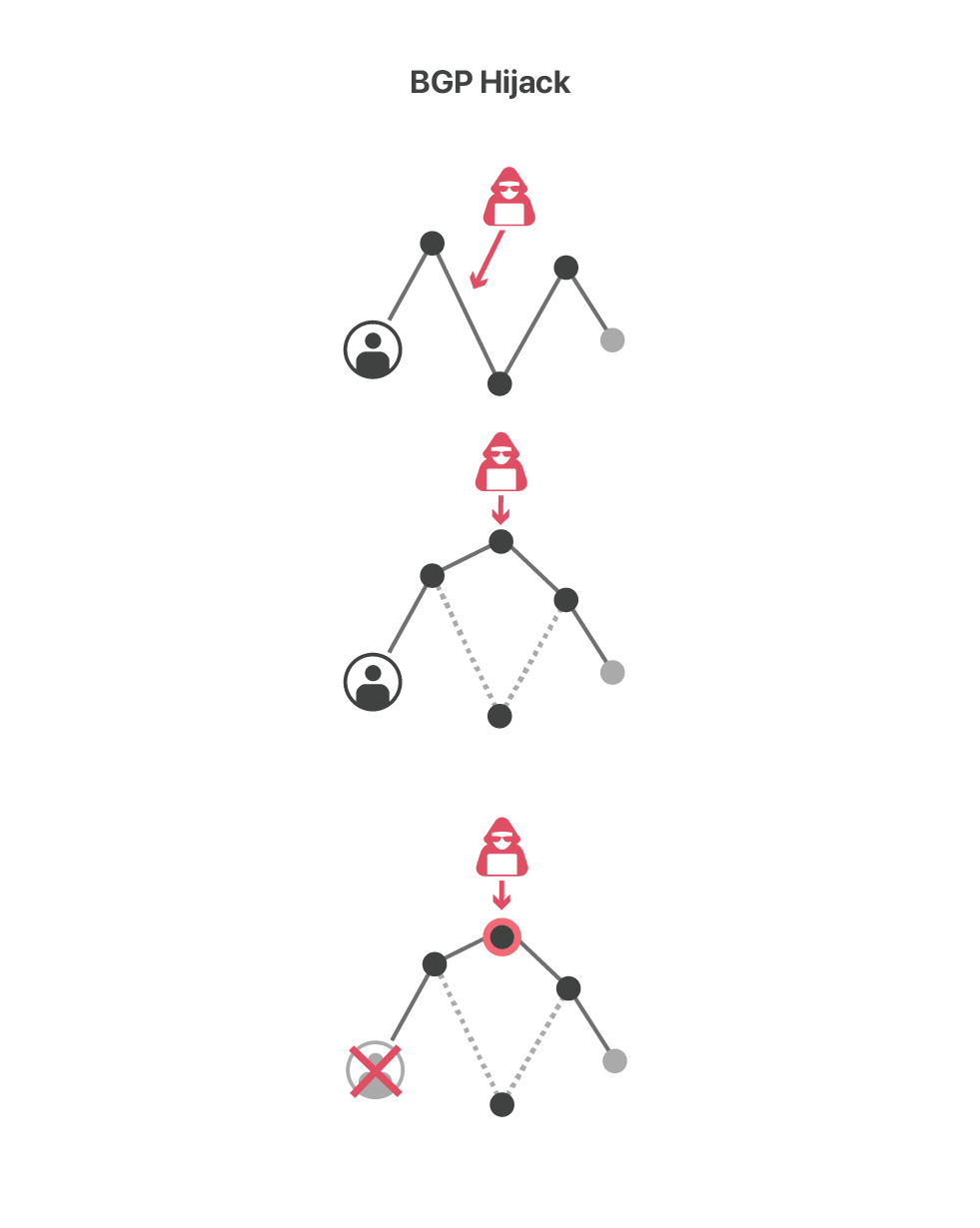 Any network can announce any set of addresses to any other network, even addresses they don’t control. This leads to a phenomenon called BGP hijacking, where networks are tricked into sending data to the wrong network.