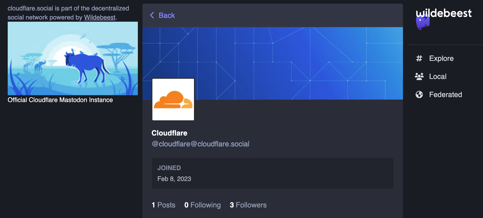 Following our dogfooding mantra, Cloudflare is also officially joining the Fediverse today. You can start following our Mastodon accounts and get the same experience of having regular updates from Cloudflare as you get from us on other social platforms, using your favorite Mastodon apps. These accounts are entirely running on top of a Wildebeest server: