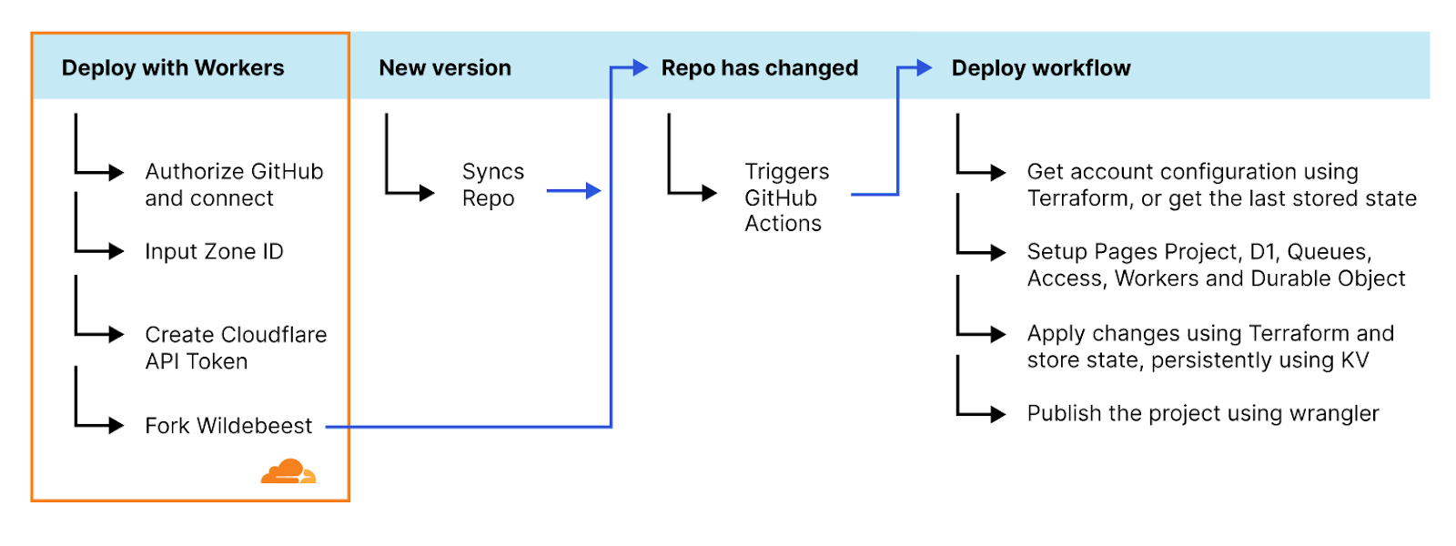 We use Terraform, a declarative configuration language and tool that interacts with our APIs and can query and configure your Cloudflare features. Here's the trick, whenever we apply a new configuration, we keep a copy of the Terraform state for Wildebeest in a Cloudflare KV key. When a new deployment is triggered, we get that state from the KV copy, calculate the differences, then change only what's necessary.