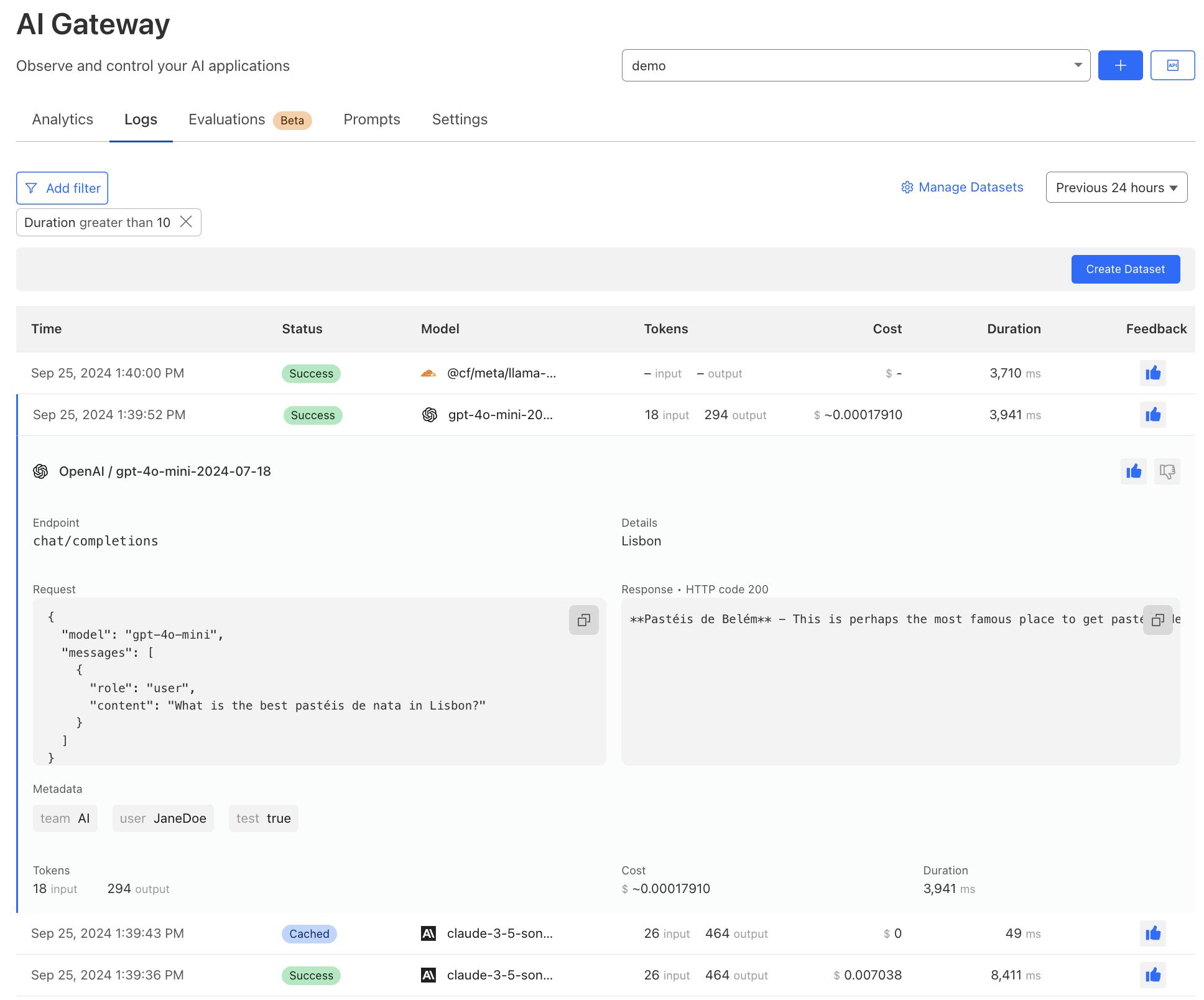 We have revamped our logging interface to offer more detailed insights, including cost and duration. Users can now annotate logs with human feedback using thumbs up and thumbs down. Lastly, you can now filter, search, and tag logs with custom metadata to further streamline analysis directly within AI Gateway.
