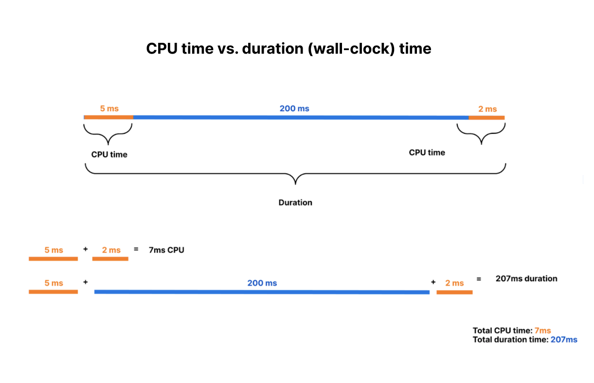 Imagine a similar scenario in your own life — you grab a cab to go to the airport. On the way, the driver decides to stop to refuel and grab a snack, but leaves the meter running. This is not time spent bringing you closer to your destination, but it’s time that you’re paying for. Now imagine for the time the driver was refueling the car, the meter was paused. That’s the difference between CPU time and duration, or wall clock time.