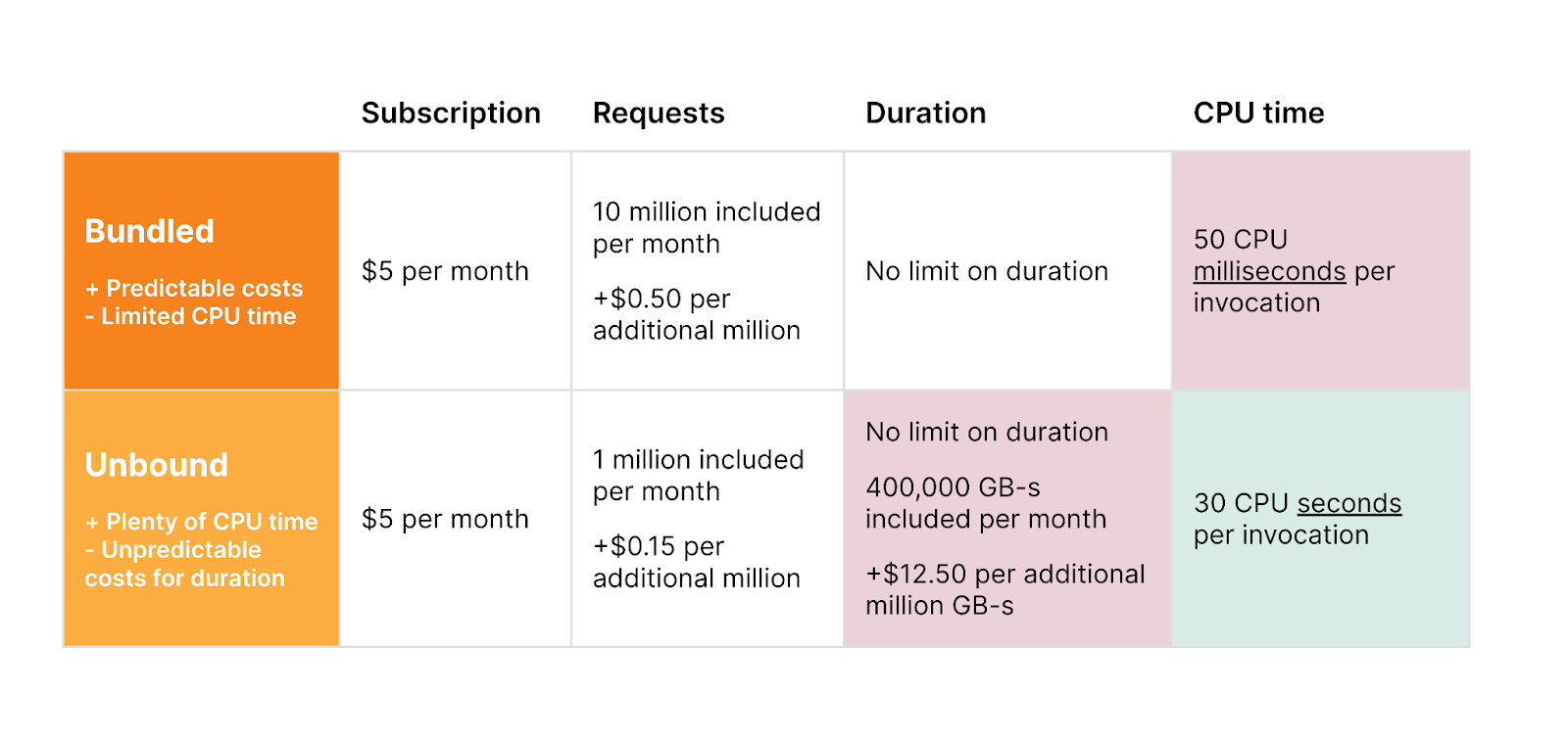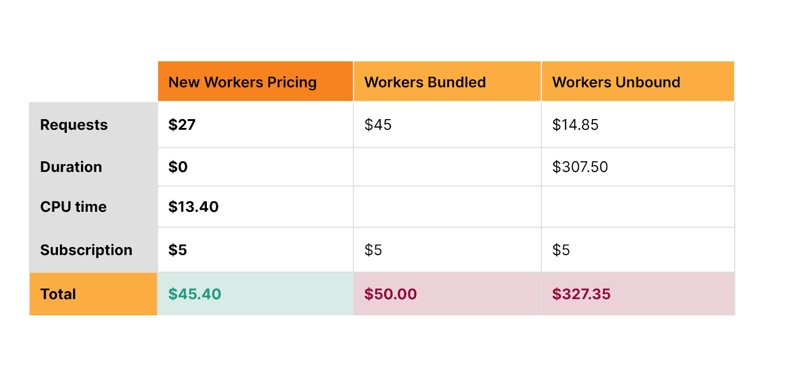 Today we are announcing new pricing for Cloudflare Workers and Pages Functions, where you are billed based on CPU time, and never for the idle time that your Worker spends waiting on network requests and other I/O. Unlike other platforms, when you build applications on Workers, you only pay for the compute resources you actually use.