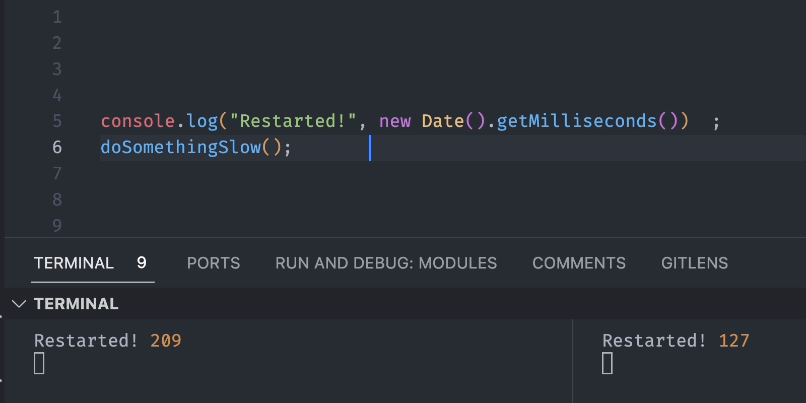 In this gif, the current timestamp in milliseconds is printed to the console on restart.