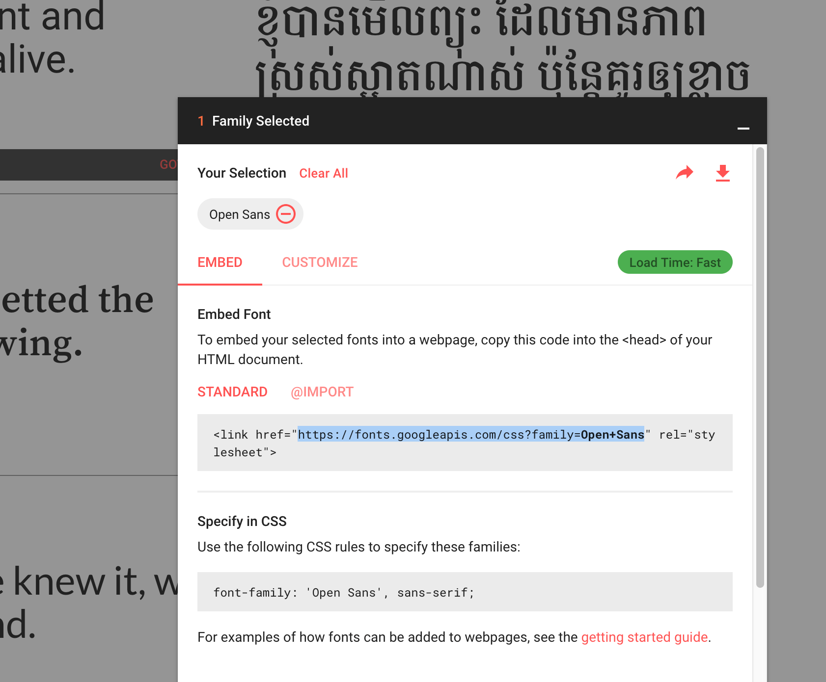 You go to Google Fonts and pick a font like Open Sans, and it gives you either a <link> or an @import with a URL there in which to ready this font for usage on your site.