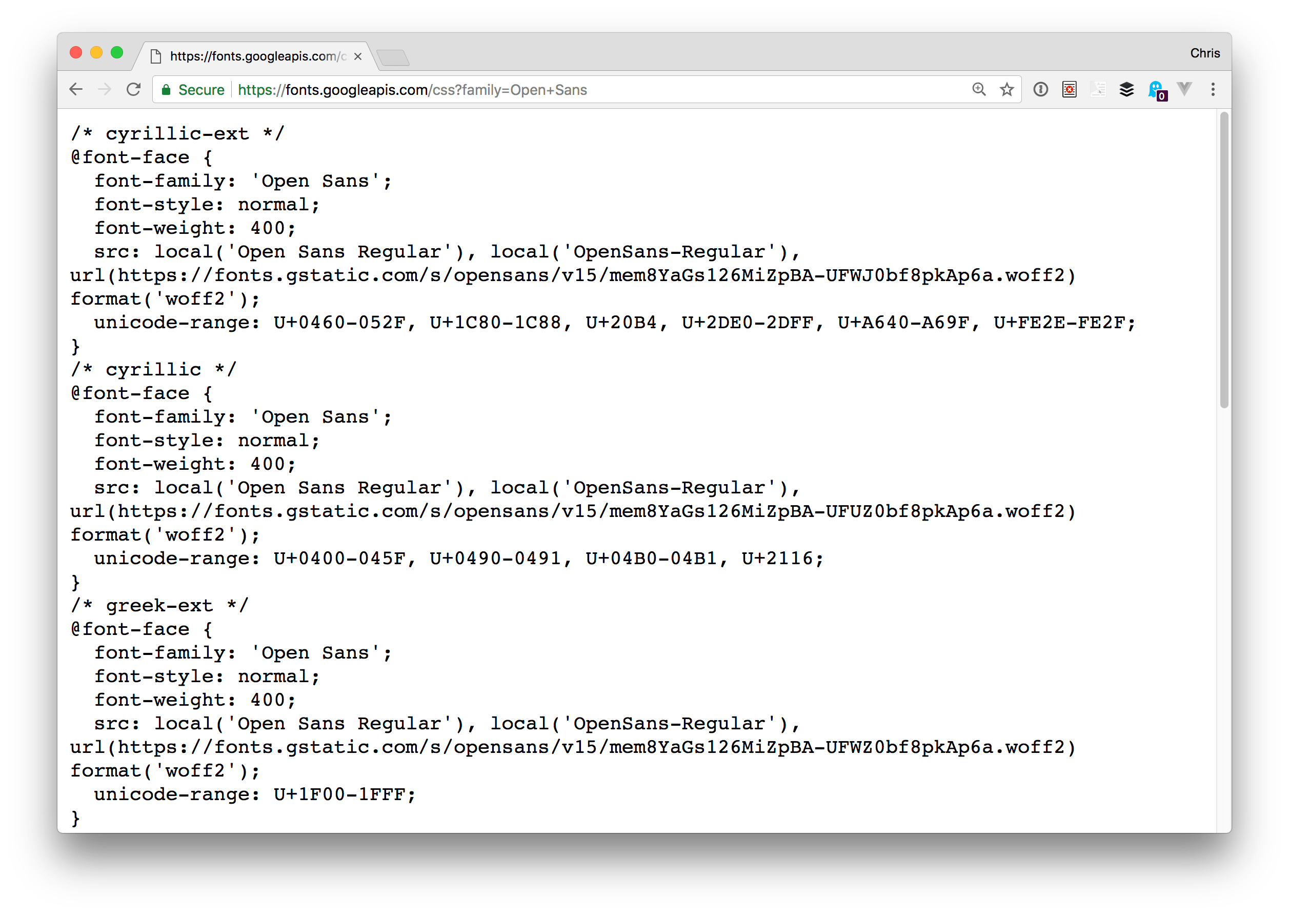 Now your performance-minded brain kicks off. Wait. So, I make one HTTP request for this stylesheet, and then it makes more HTTP requests for those woff2 files it’s linking up. Screw the middle man here, why not just copy those @font-face blocks right out of here and use them.
