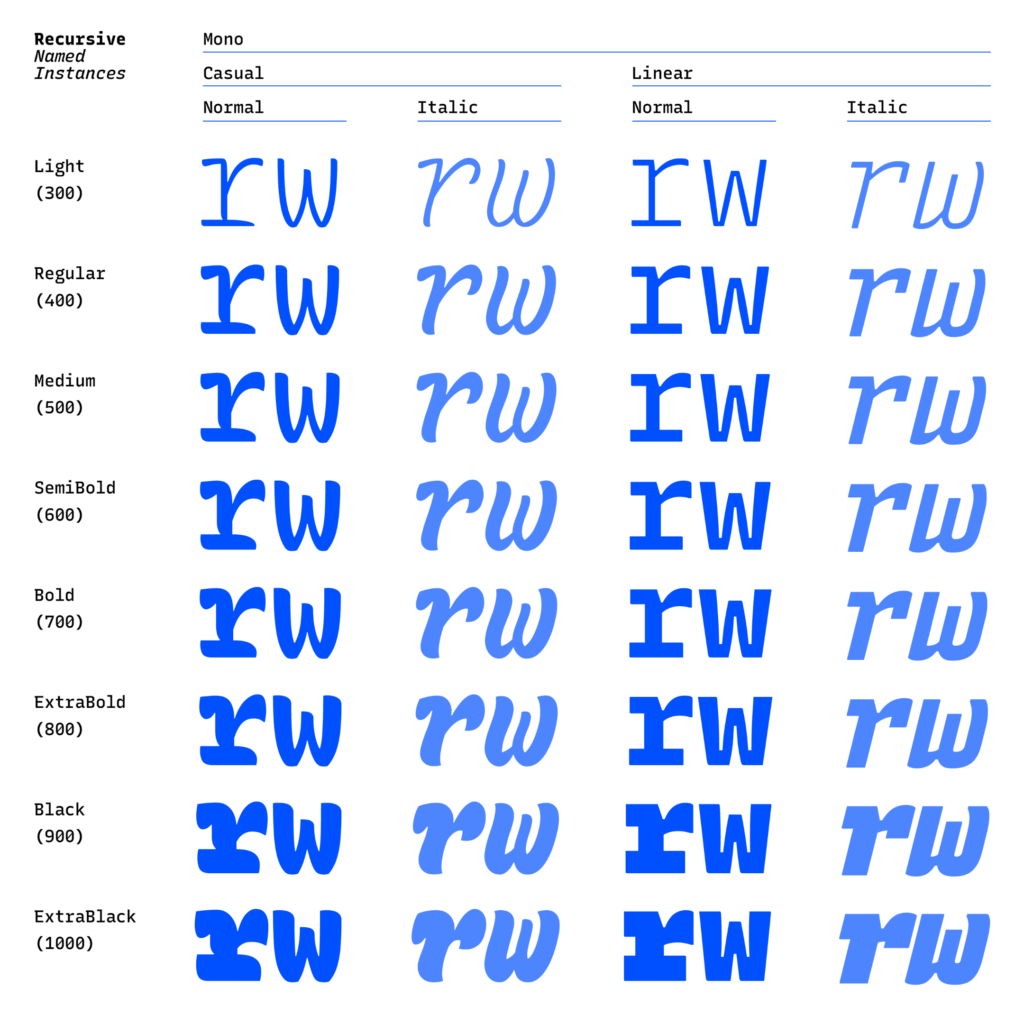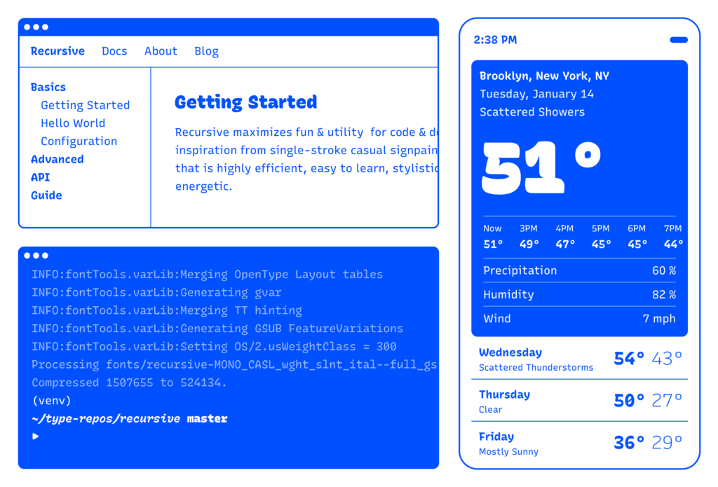 First, a necessary definition: variable fonts are font files that fit a range of styles inside one file, usually in a way that allows the font user to select a style from a fluid range of styles. These stylistic ranges are called variable axes, and can be parameters, like font weight, font width, optical size, font slant, or more creative things. In the case of Recursive, you can control the “Monospacedness” (from Mono to Sans) and “Casualness” (between a normal, linear style and a brushy, casual style). Each type family may have one or more of its own axes and, like many features of type, variable axes are another design consideration for font designers.