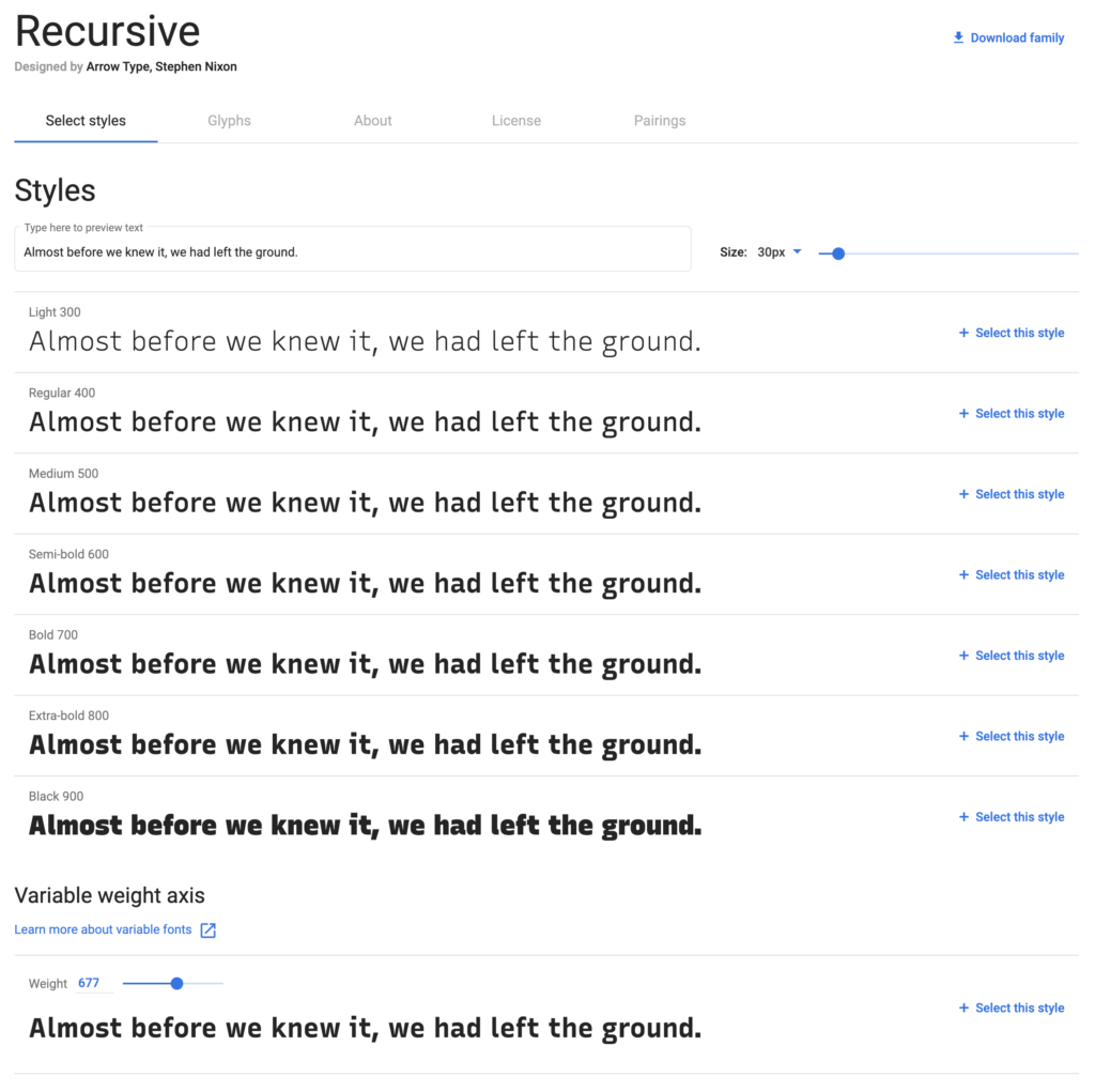 But again, the main Google Fonts interface only provides access to eight of those styles, plus the Weight axis: