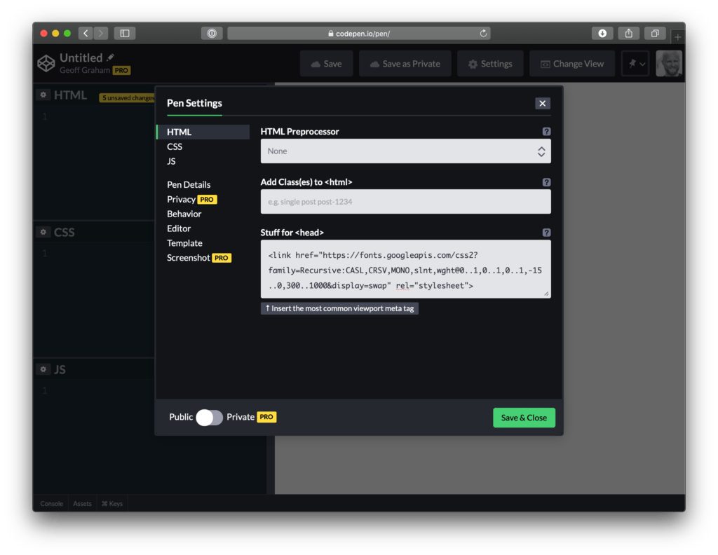 Also, Recursive is actually designed first as a font to use for code. You can use it on CodePen via your account settings. Better yet, you can download and use the latest Recursive release from GitHub and set it up in any code editor.