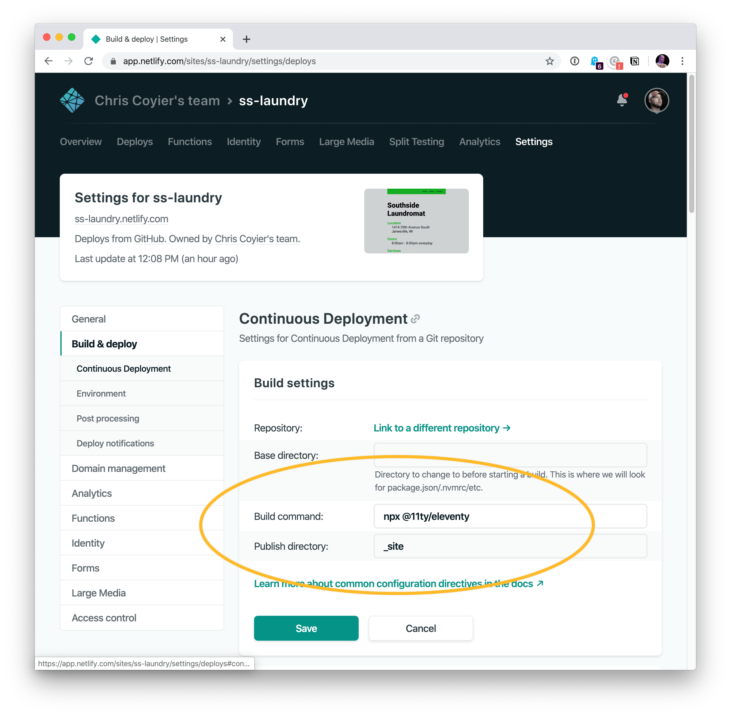 Say I want to deploy this static site… over on the Netlify side, I can tell it that what I want deployed is that _site