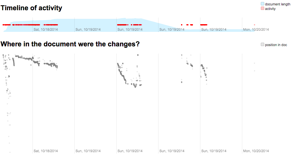 Here’s a graph that Draftback automatically produced for an article I was working on a few weeks ago. It shows the timeline of my changes, and below it, a “map” that tells me where in the document each of those revisions happened: the further down the graph, the further down the page. At the start, I added many thousands of words of notes — that’s why the doc gets so long so fast, and why the edits look sparse. Then you can see that I made three distinct passes, the first one focused on the top of the article, and slow; and the later ones faster and further down. A visual fingerprint of a document, and of a writer.
