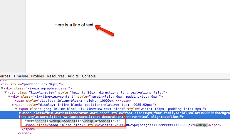 So what I did was I looked in the web inspector and found the DOM I cared about. I found out that all the actual content has these classes like kix-page and kix-lineview and kix-wordhtmlgenerator-word-node. (Google’s codename for their Docs edit surface and rendering engine is “Kix.”) I figured that I could do something like this in a Chrome extension: