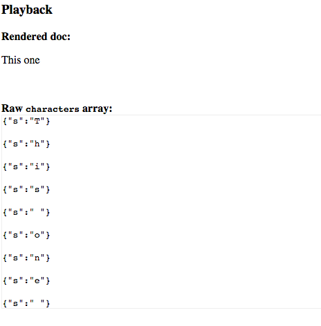 These didn’t seem so hard to figure out. You have what looks like a “multi” or bundle operation, and then inside of it, a list of other operations: some inserts and some deletes. For inserts, you have the string you’re adding; for deletes, the indexes that tell you what to remove. I built myself a debugging tool that would let me step through a list of these revisions, to see both a rendered document and a dump of the critical characters array I was using to represent it under the hood: