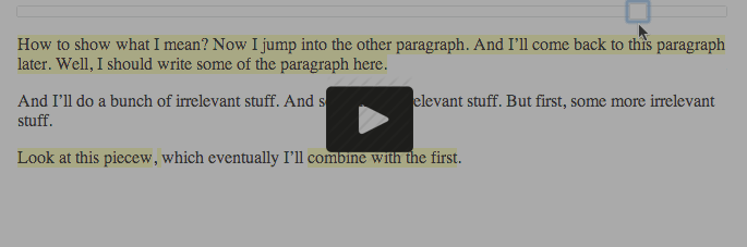 Here, for instance, you can see me typing a short document. Focus on the first paragraph: you’ll see that it wasn’t written in one contiguous swoop, but rather was cobbled together over time via a bunch of discontinuous edits: I edit the paragraph, then do other stuff, then I come back to the paragraph, and so on. I even cut and paste a phrase from one paragraph to another.