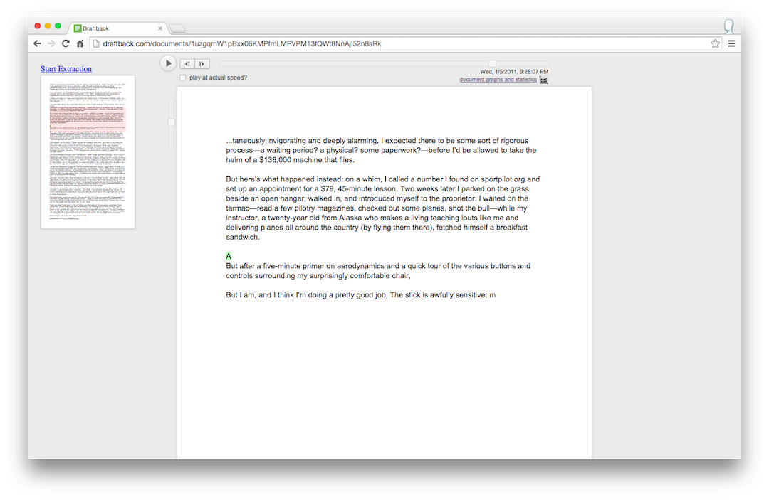 See that little gizmo above? It’s like a video player, but made especially for writing. This one’s from an Atlantic article I began work on nearly four years ago, on the day after Christmas in 2010. The article was about the first (and only) time I got to fly a small airplane. At the time, I didn’t give the slightest thought to the idea that one day I’d be able to watch the draft unfold. But since I happened to write this one in Google Docs, I can recover every keystroke. Above, you can see the first uncertain stirrings of the first paragraph.