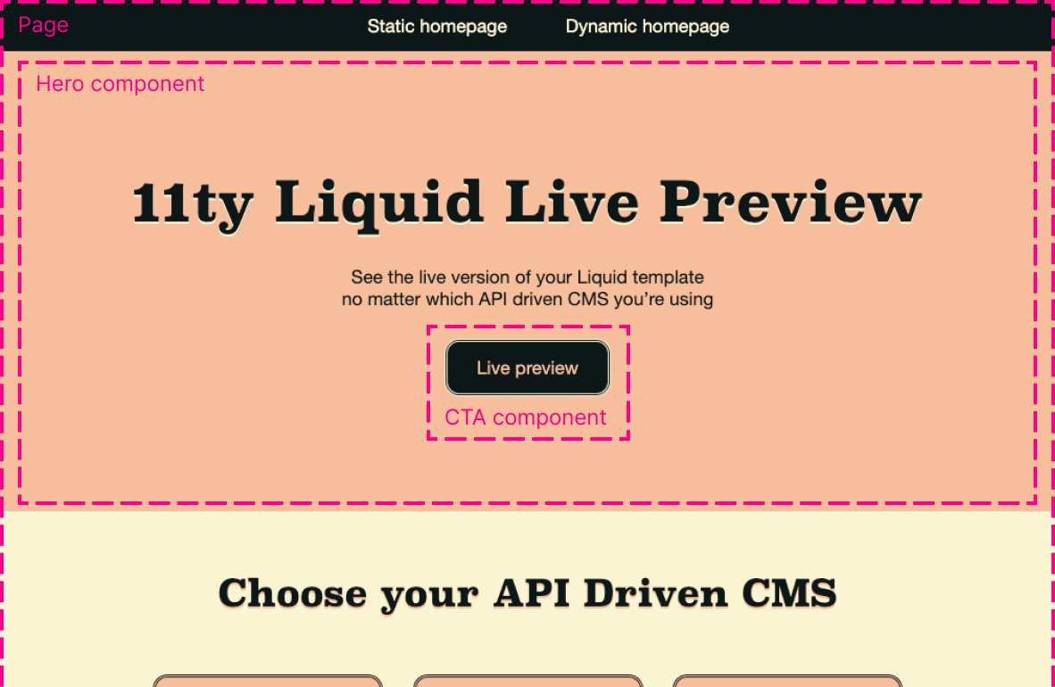 The pages consist of components that could include other components. For example, the homepage has a hero component with a call-to-action button (CTA), which is also a component.