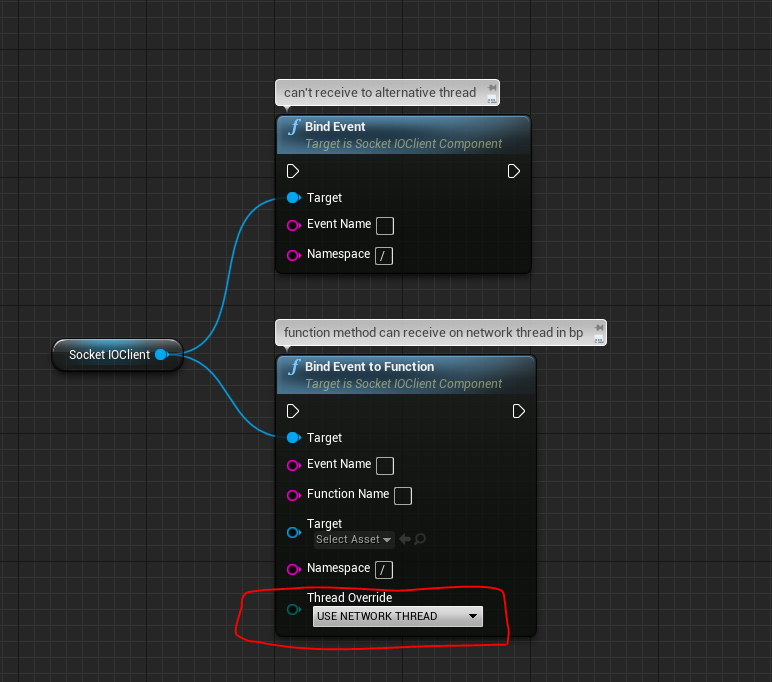 Since v1.1.0 use Bind Event to Function and change the thread override option to Use Network Thread.