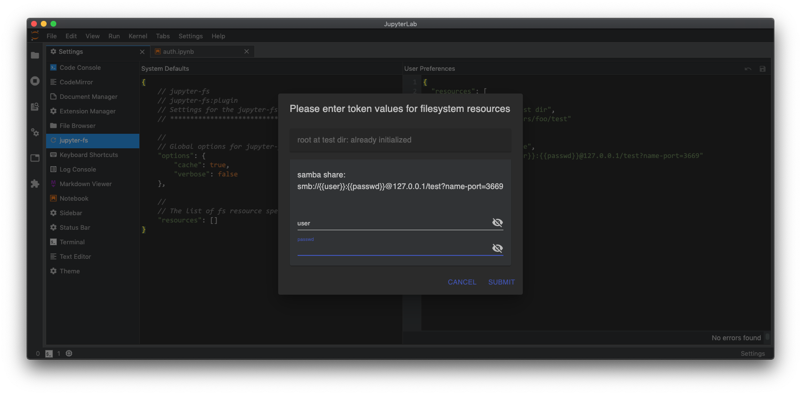 - JupyterLab first loads, if any fs resources require auth