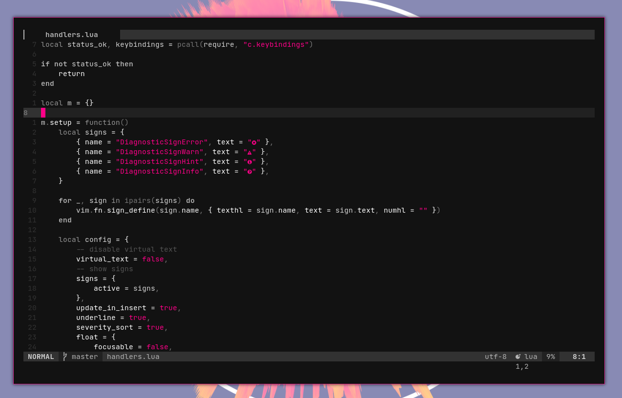 A dark minimal vim theme with a touch of hot pink (magenta?).