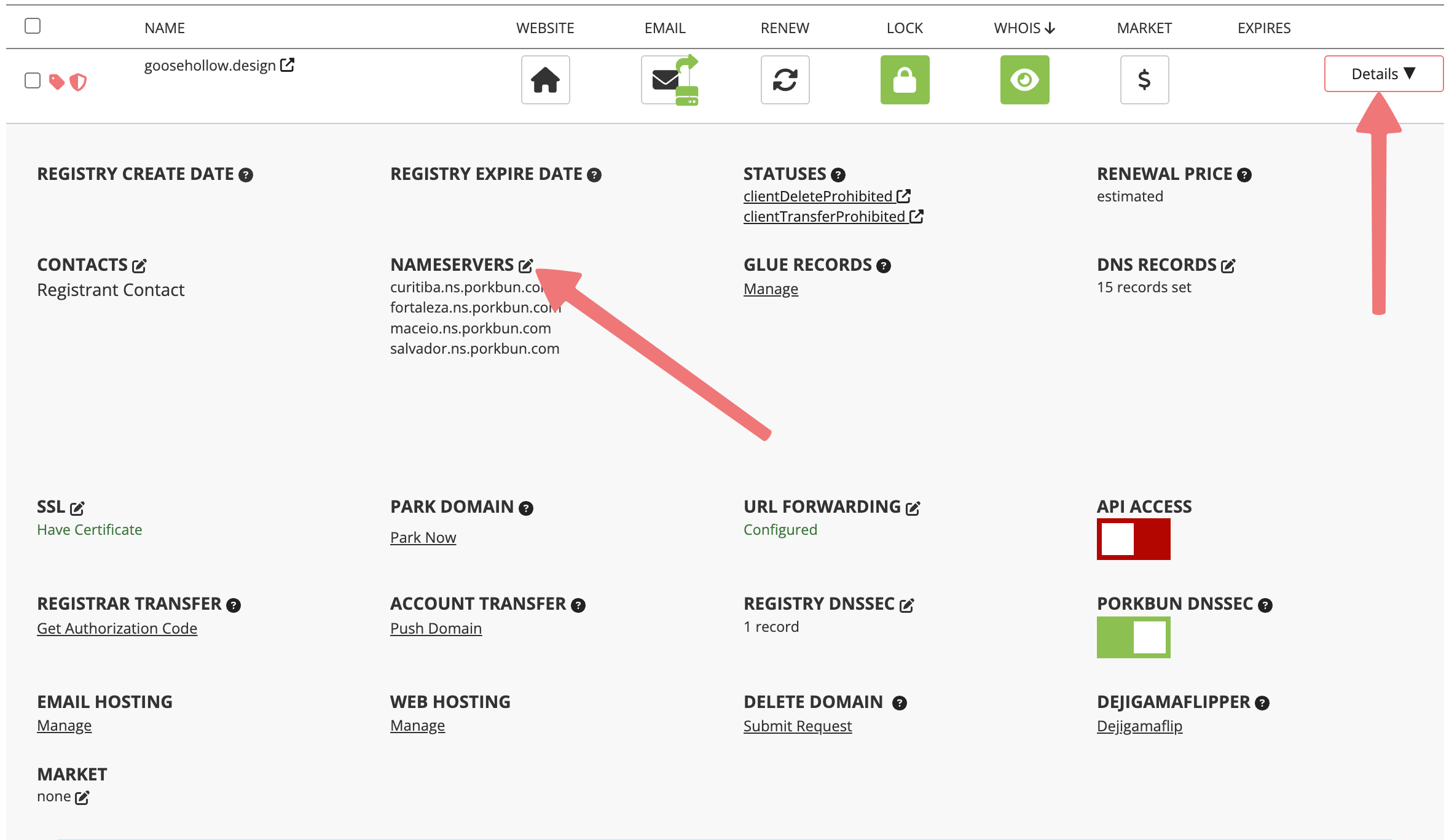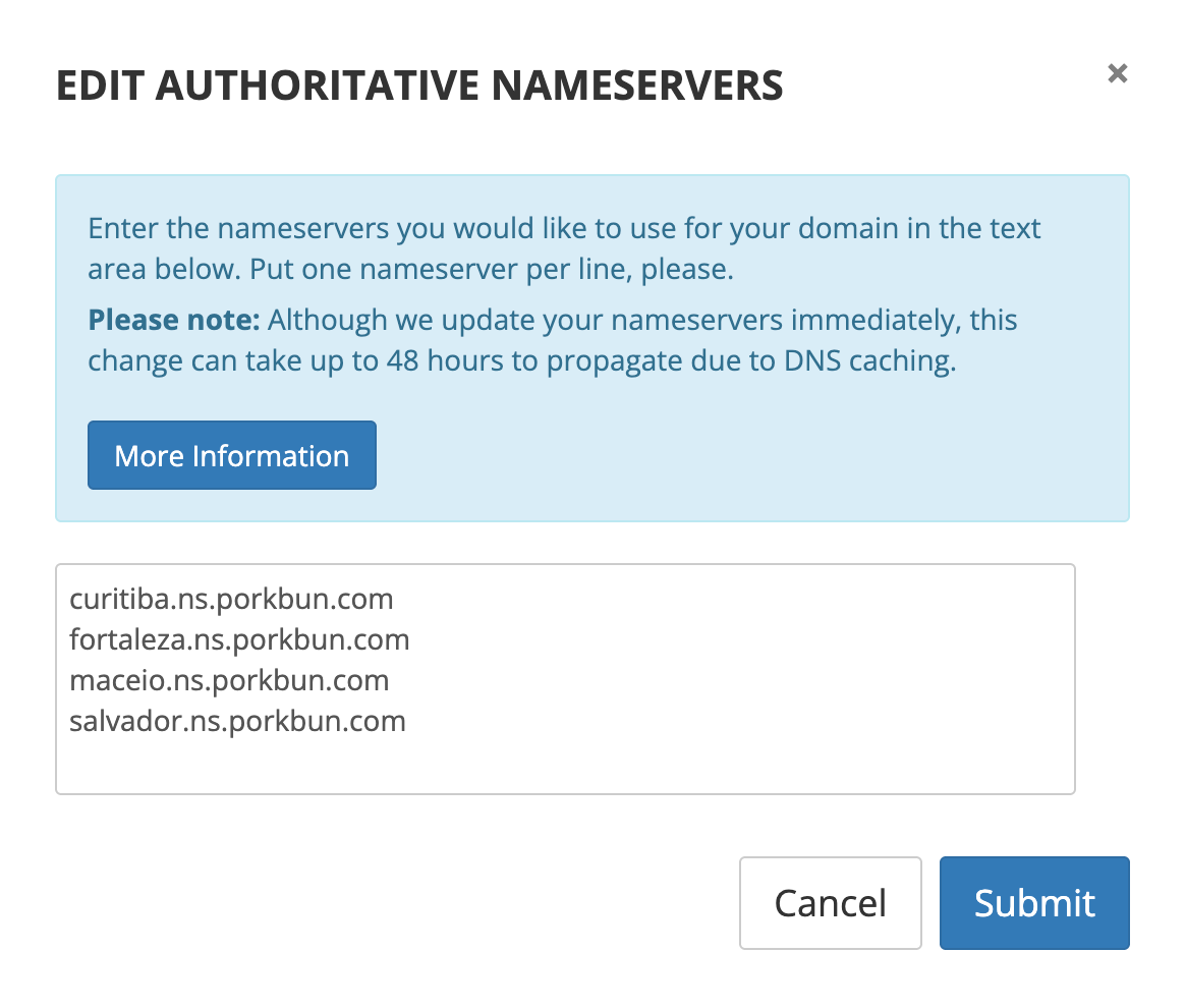 If you are switching from an external provider's nameservers to Porkbun's nameservers, this menu will look slightly different. You can review our guide on changing to Porkbun's default nameservers for more details.