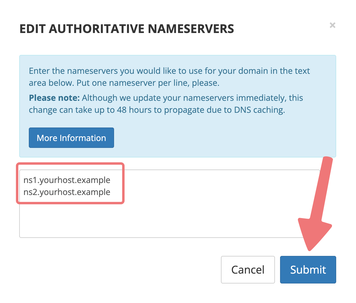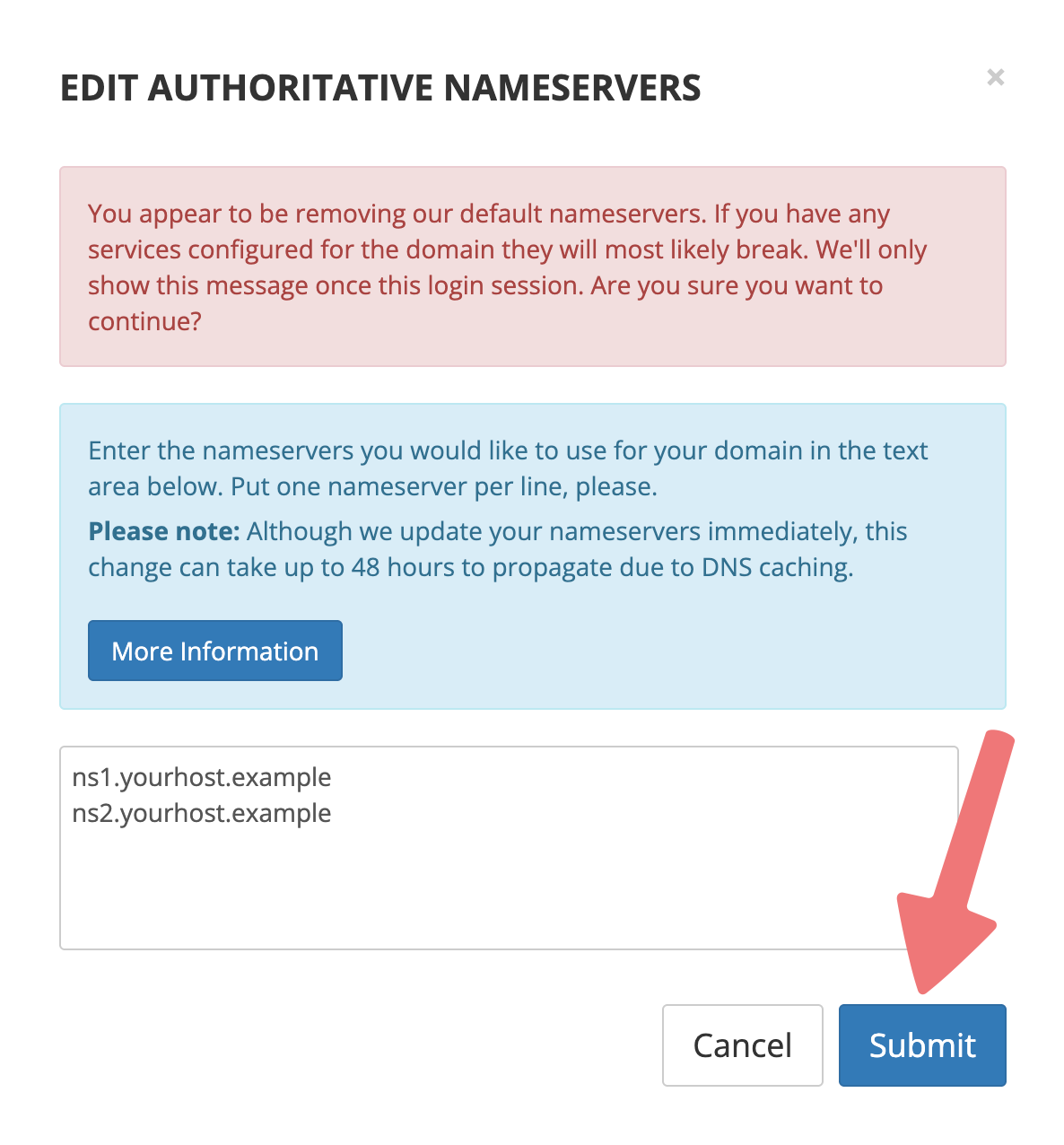 Please note that if you wish to use an authoritative nameserver that is tied to the domain name itself (such as ns1.yourdomain.com), you'll first need to create a "glue" record in your domain's settings under the Details menu. This guide explains more.