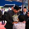 Sambil mengenakan pakaian adat tradisional asal Indonesia, dua anak tersebut memberikan buket bunga kepada Prabowo.