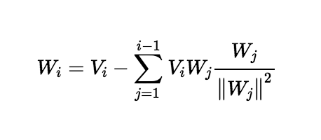 W_i = V_i - sum (V_i * W_j * W_j / ||W_j||^2) from j=1 to i-1