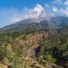 Pengunjung mengambil foto pemandangan Gunung Merapi dengan kamera telepon pintarnya di obyek wisata Kali Talang, Balerante, Klaten, Jawa Tengah, Rabu (19/12/2018). Masyarakat setempat memanfaatkan kawasan rawan bencana (KRB) Gunung Merapi untuk dijadikan tempat wisata seperti gardu pandang Gunung Merapi untuk meningkatkan potensi wisata lokal yang dapat menjadi sumber pencaharian bagi masyarakat.Dengan duduk di gazebo, wisatawan akan terlindung dari panas matahari karena terdapat atap.
