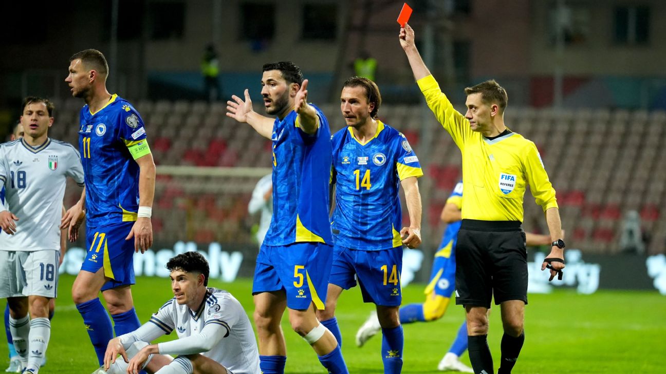 El defensor de Italia llegó tarde en un cruce y dejó a su equipo con diez jugadores ante Bosnia y Herzegovina.