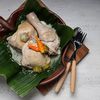 4. Sendokkan campuran ayam ke atas daun pisang. Sertakan kuah santannya secukupnya.