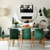 Untuk mencegah warna yang kuat mendominasi ruang makan, Christina memilih Super White (PM-1) dari Benjamin Moore untuk menonjolkan detail arsitektur ruangan dan menempatkan karpet bertekstur berwarna terang di bawah kaki.